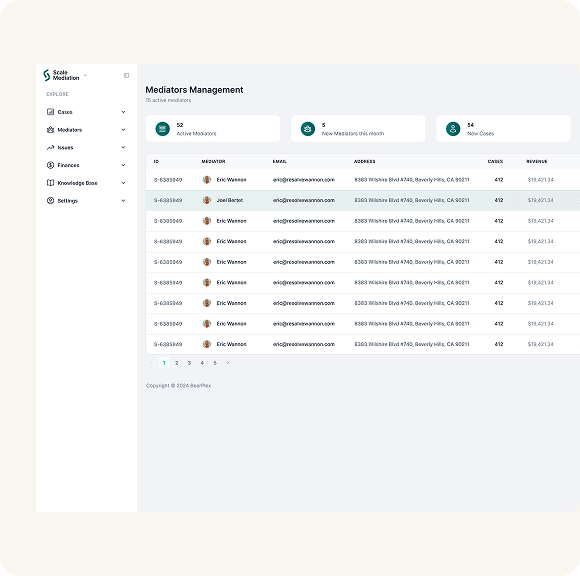 Scale Mediation’s built-in CRM automatically pulls every participant from your mediations into an organized, trackable contact list — no manual entry or spreadsheets required. All case details and outcomes flow seamlessly into your CRM, helping you stay connected and manage your practice more efficiently.