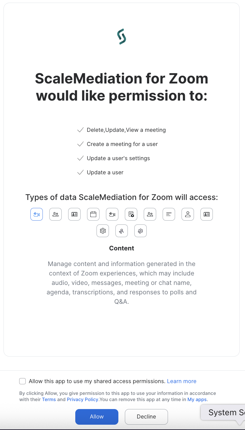 You will be redirected to the official Zoom website and prompted to sign in to your Zoom account (if you aren’t already). Zoom will then ask you to authorize the Scale Mediation app to access your meeting and user information. Click the “Allow” or “Authorize” button to proceed.